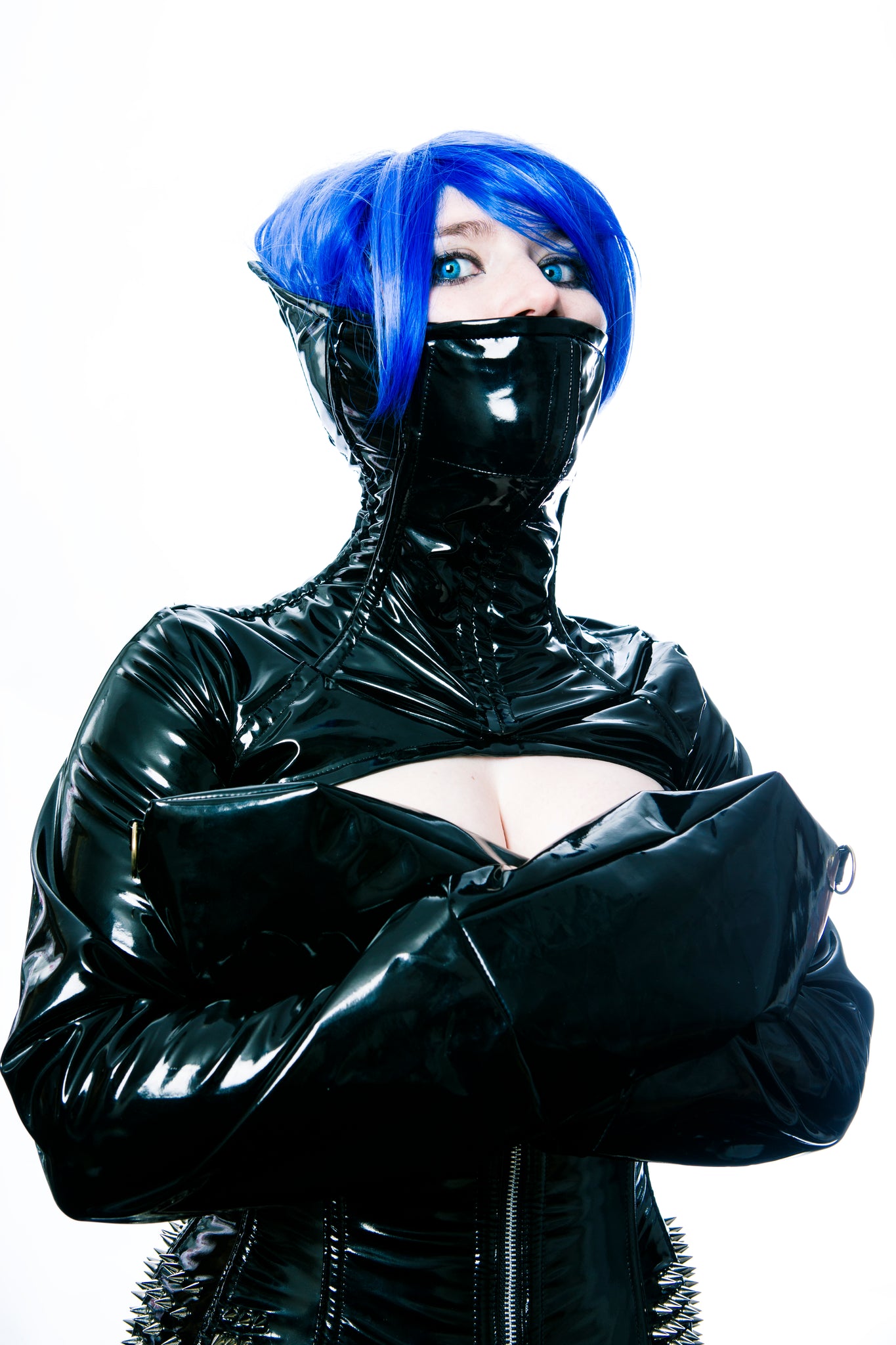 This is my kinkiest design yet which is a neck corset strait jacket for adult play time made from heavy weight high quality PVC. The neck corset covers the mouth yet fits like a Jacket and is laced up at the back like a corset. It sits high on the back of your head. The sleeves have D rings on the end so they can be hooked together to restrict your partner even more.